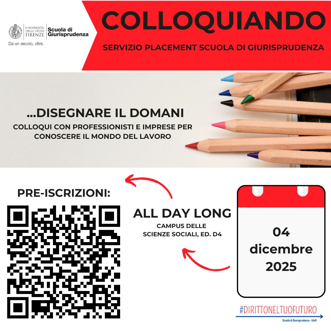 Il Servizio Placement della Scuola di Giurisprudenza dell’Università di Firenze organizza una nuova edizione di COLLOQUIANDO, l’iniziativa dedicata all’incontro tra laureandi, laureati, studi professionali, imprese ed enti pubblici e privati.