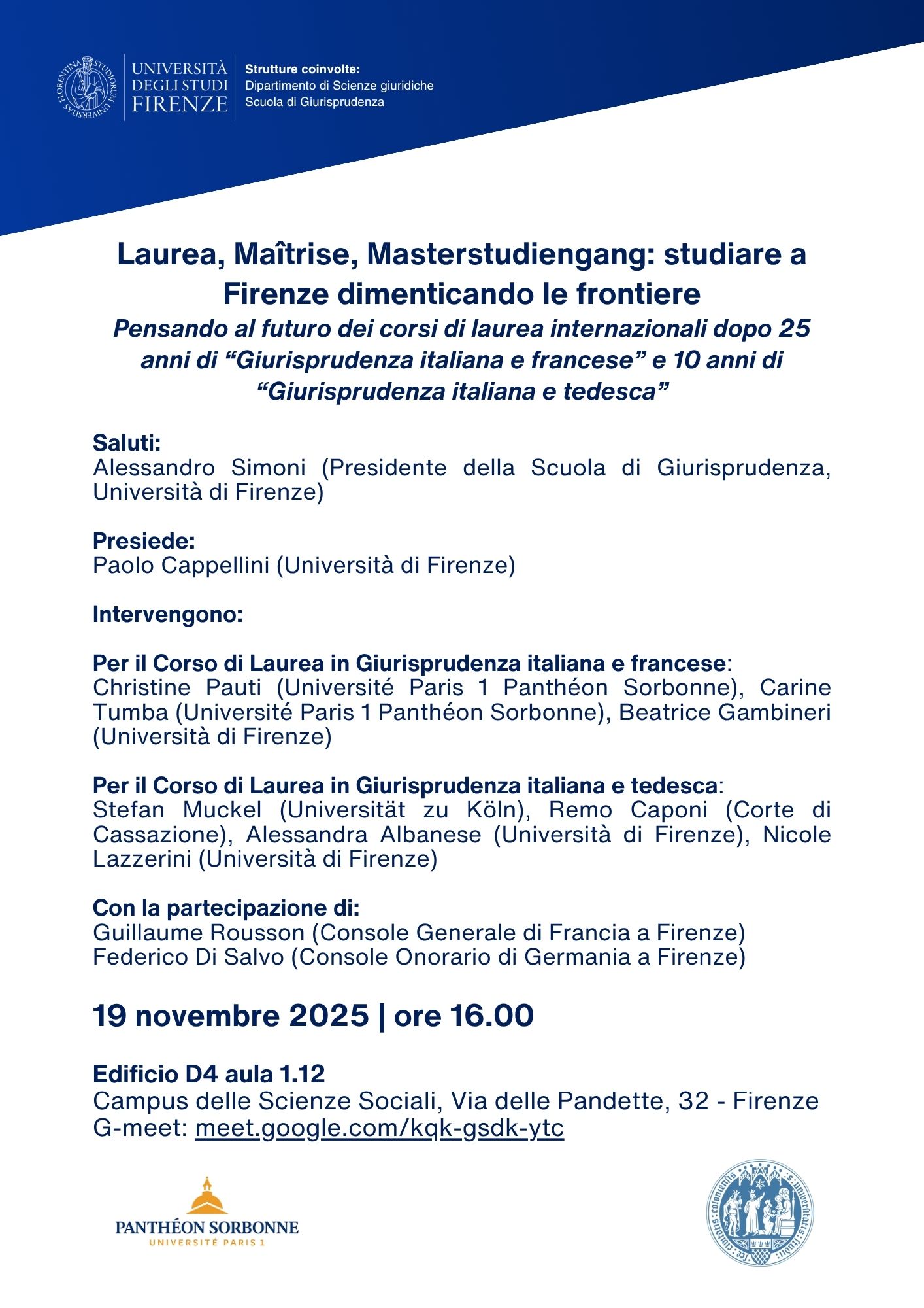 L’incontro, promosso dalla Scuola di Giurisprudenza dell’Università di Firenze, intende riflettere sul futuro dei corsi di laurea internazionali che hanno contribuito in modo significativo alla formazione di generazioni di giuristi europei, celebrando due importanti traguardi: