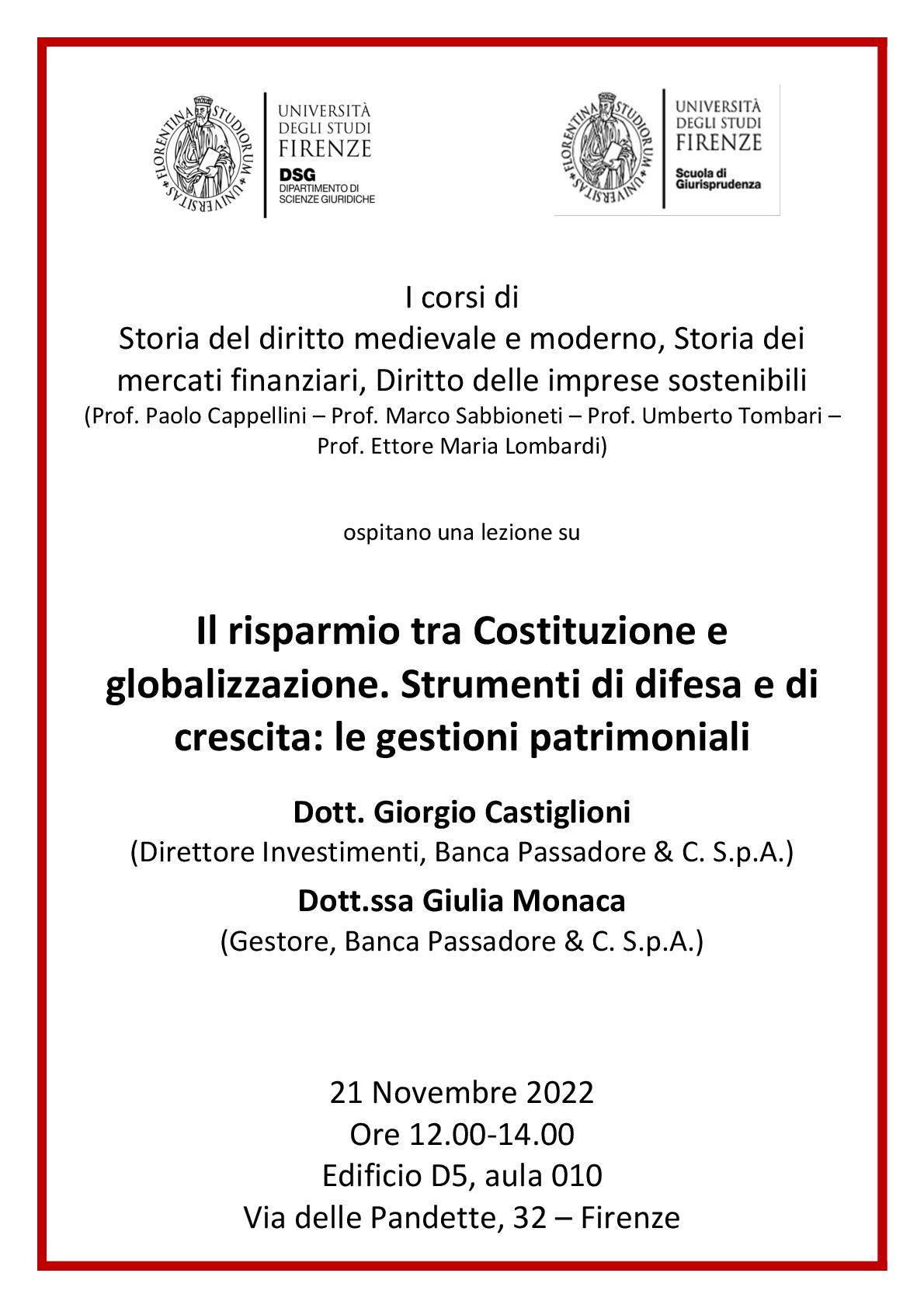 I corsi di Storia del diritto medievale e moderno, Storia deimercati finanziari, Diritto delle imprese sostenibili