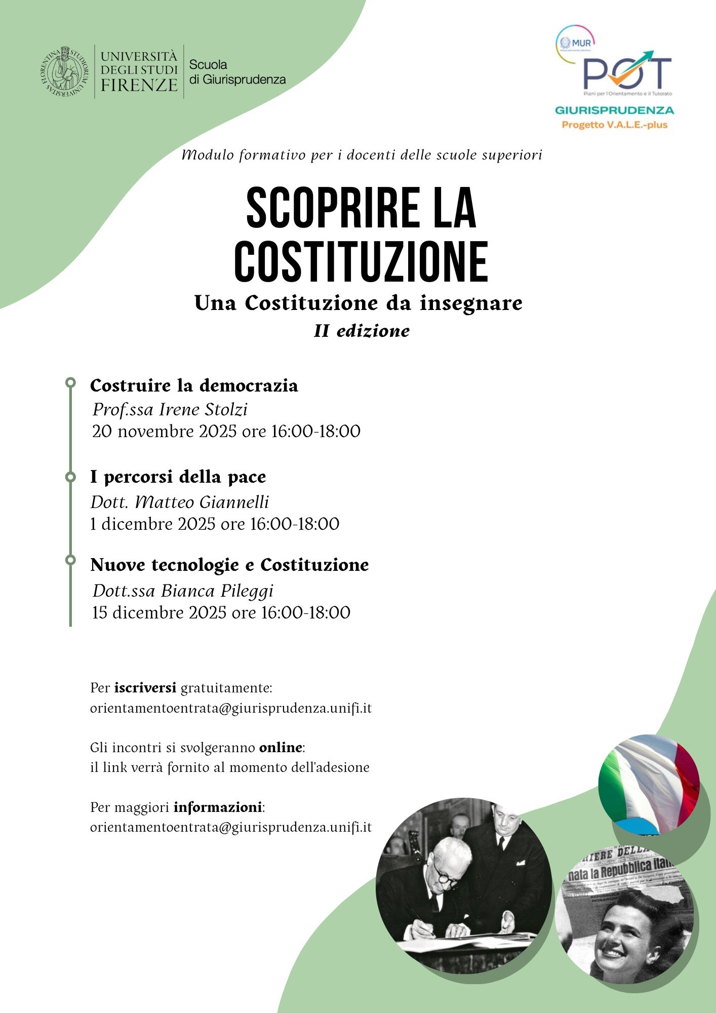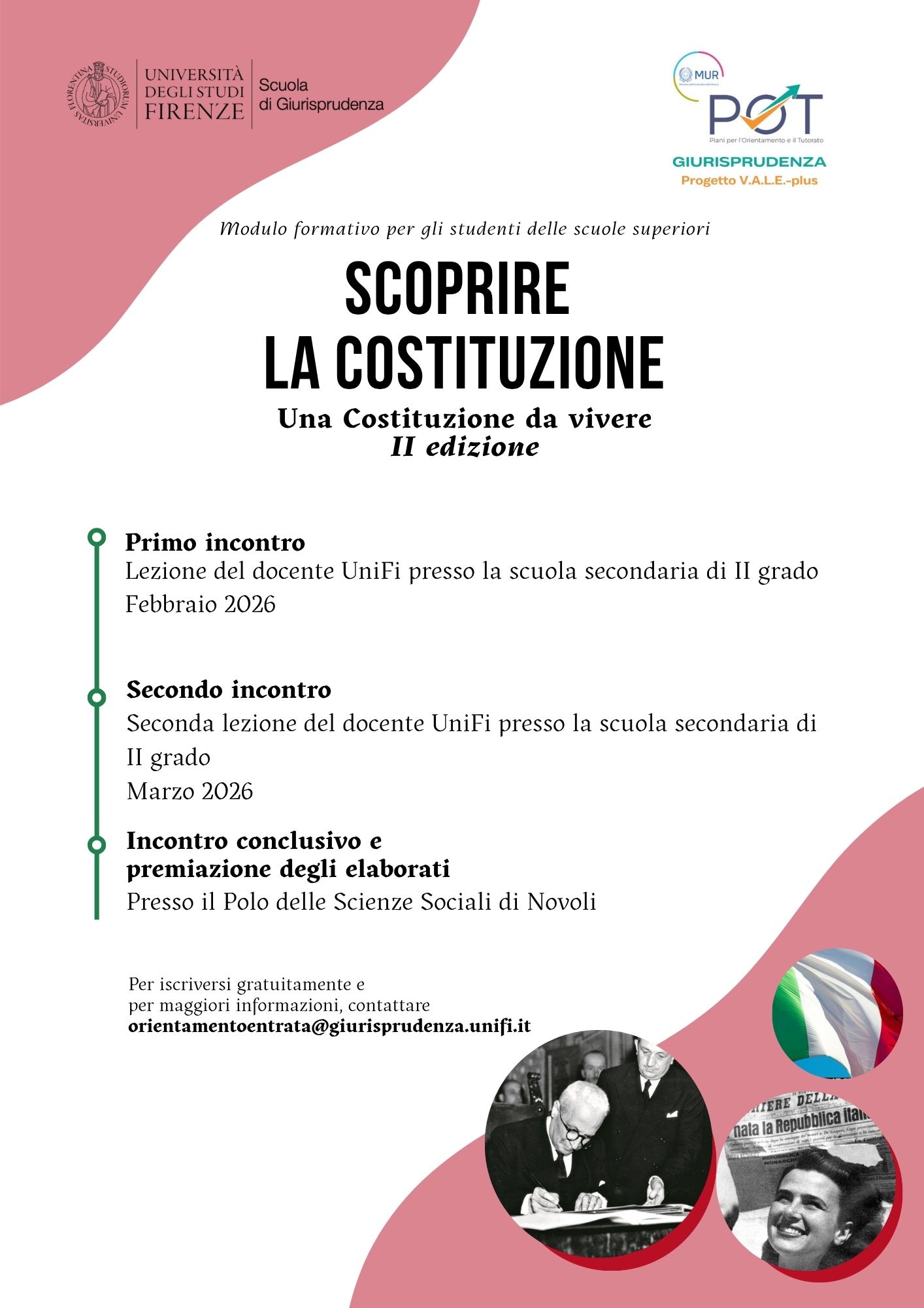 Si tratta di due azioni coordinate rivolte alla formazione sia degli studenti sia dei docenti delle Scuole Superiori all’interno del percorso “Scoprire la Costituzione - Una costituzione da insegnare e da vivere”, con l’obiettivo di fornire i primi strumenti per ragionare criticamente su questioni giuridiche di attualità che coinvolgono il più ampio agire nella società come individui consapevoli.