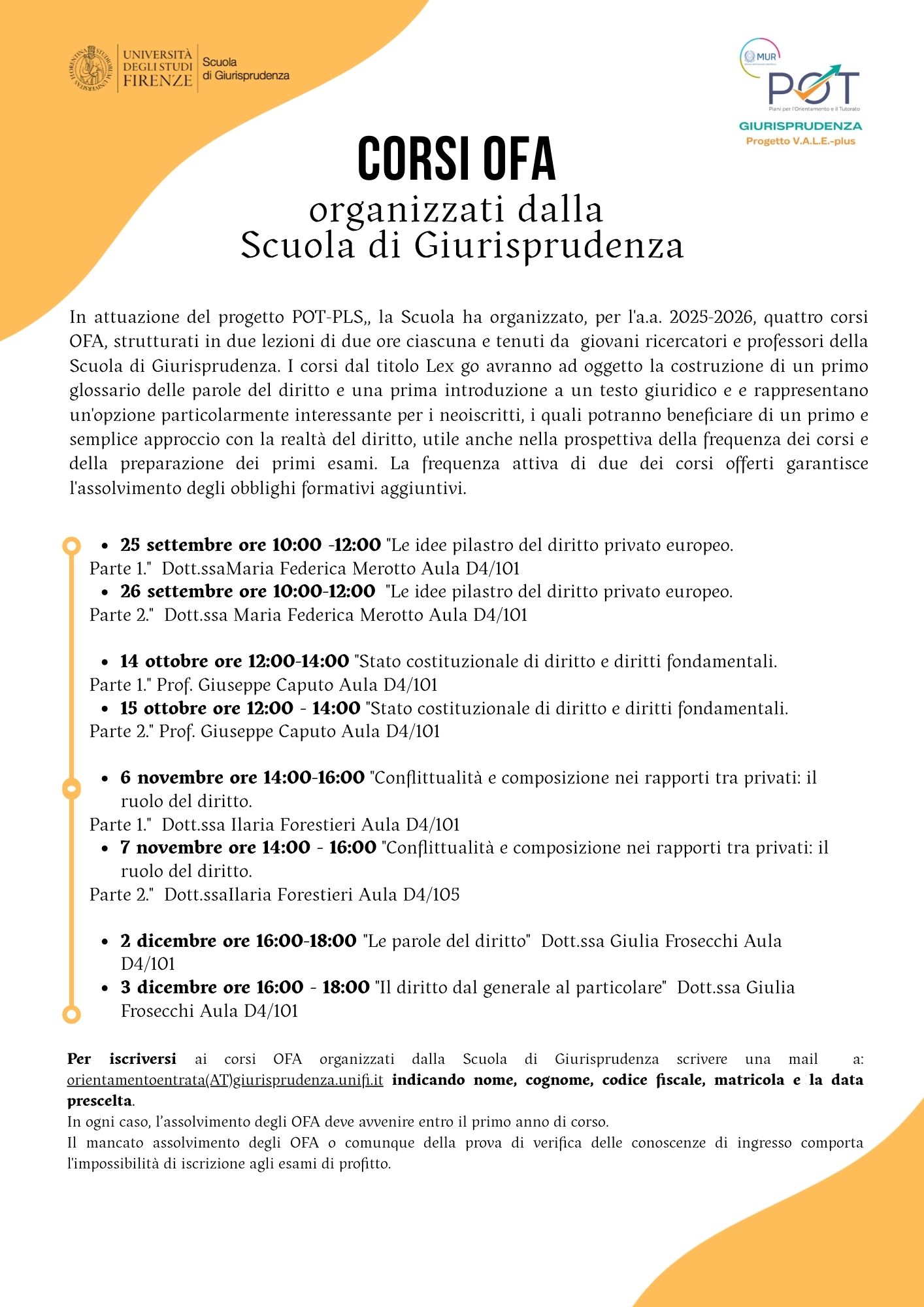 Corsi OFA organizzati dalla Scuola di Giurisprudenza